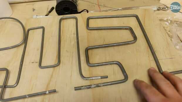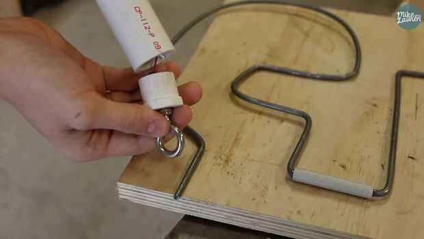 Usé un tornillo y un martillo para doblar 1/4" y 3/8" acero varilla en su forma final. El gancho del ojo se une al positivo del transformador. El cable que sale de la parte inferior que se remonta a la Junta Directiva es el suelo. Cuando el ojo gancho hace contacto con la varilla, se energiza en 1.3, 2.6 o 5 voltios dependiendo del nivel.