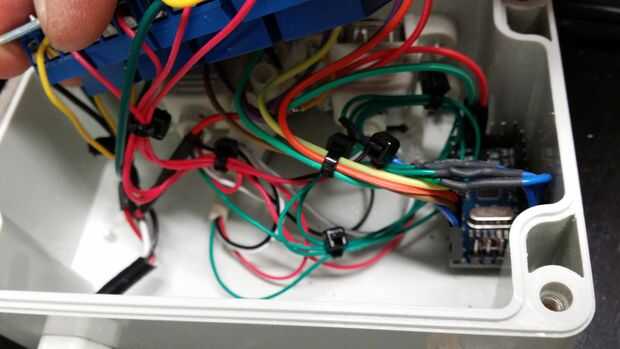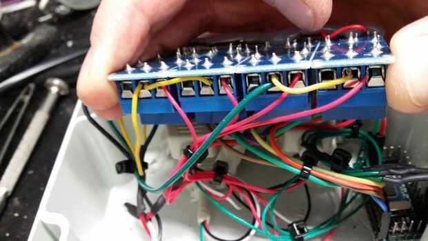 Para mantener la caja pequeña y números de cables al mínimo soldado motivos comunes y tensiones de alimentación en el relé. Además de añadir un montón de amarres de cable para mantenerlo ordenado. También cubrí las juntas soldadas con pegamento caliente para ayudar contra tensiones mecánicas.