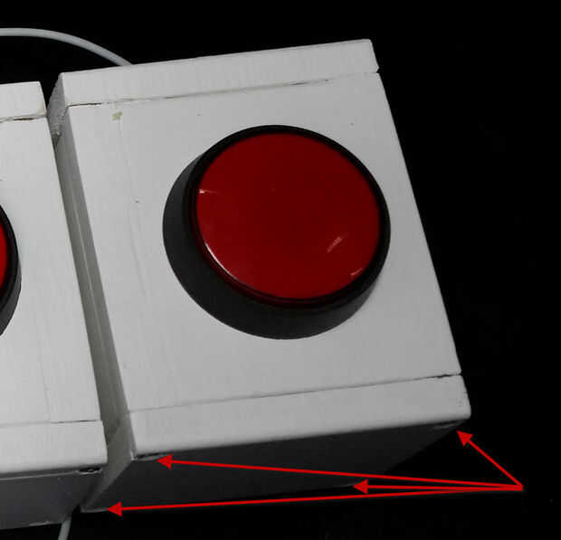 Esta fue la parte más difícil para mí, busqué alta y baja una caja barata, lata, caja. Al final decido hacer mi propio como es la forma más rápida y barata de conseguir lo que necesitaba. ¿Por eso es tan grande, comparado con tiradas? También hay casos cuando las personas están en equipos por lo que necesita una caja fuerte grande y botón, modo semi intoxicados personas tienen oportunidad de buzz en.