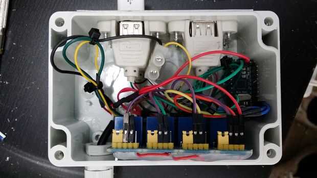 Como se ve en la foto de la caja de control la placa trasera USB ha sido tierra hacia abajo con una dremel para una mirada más limpia. También necesitaba sustituir los tornillos originales que el conector usb con tornillos un poco más