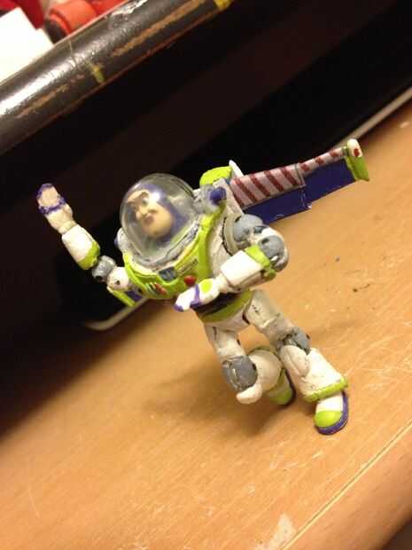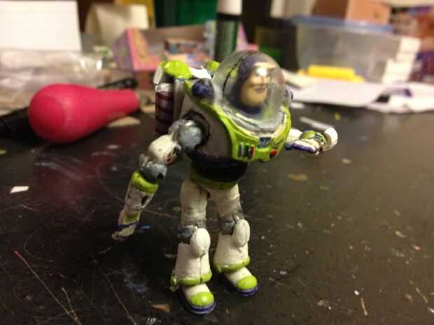 Paso 1: Buzz lightyear tiene una pierna rotaPaso 2: Usar un lápiz de color verde, cortar a la longitud de la piernaPaso 3: Meter el lápiz de color con blu-tack y dar buzz lightyear un bastónPaso 4: Él puede caminar otra vez