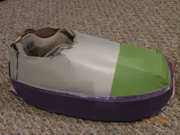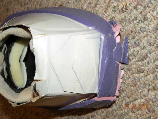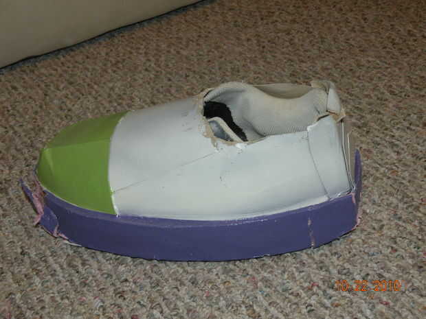 Para los pies empecé con un viejo par de zapatos que pueden ser fácilmente se deslizó dentro y fuera. (Con a cordones) Caliente pegué los zapatos a una alfombra de espuma que era una media pulgada de espesor. (Lado liso hacia abajo) Yo que les cortar en la forma de su suela. Yo que les cortan cartón para hacer el resto de los zapatos. Se debe de utilizar imágenes para esta sección porque hubo mucho de prueba y error y se pone muy difícil tratar de explicar este paso.