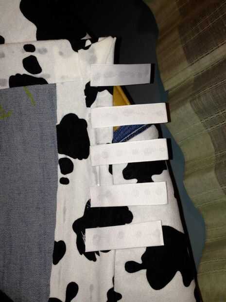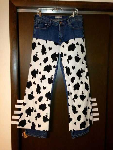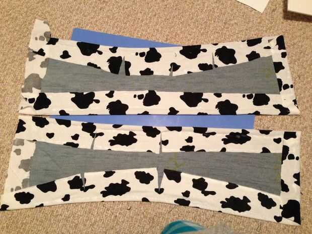Mi esposa tomó un par de viejos pantalones vaqueros y trazó la forma grietas en ellos y lo nuestro.  Ella entonces pega el material para el patrón. Una vez que se seca ella había pegado las grietas al frente de un par de jeans perdidos alto.  La hebilla estaba hecha de tela amarilla en un tablero de la espuma.