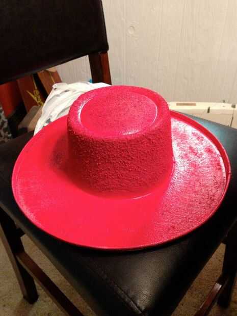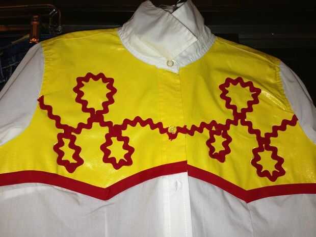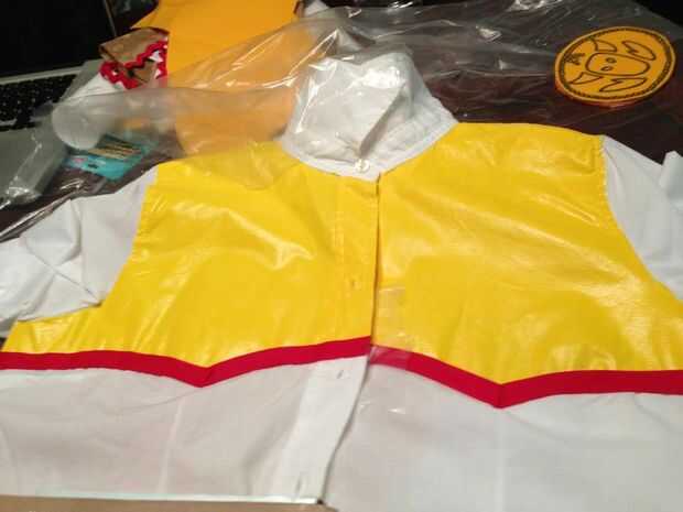 La camisa era un botón de camisa. Utilizamos tinta de impresión de pantalla para el amarillo.  Los detalles rojo se pega y cubrió a sirena. Ella compró el sombrero negro y cubierto de pegamento para madera para pintar.  Tardé tres latas de pintura pero le dio una mirada plástica.  Entonces era sólo una cuestión de perforación y colocación de las cuerdas.