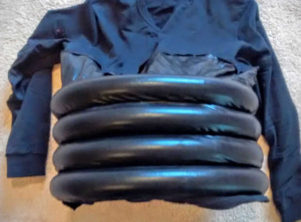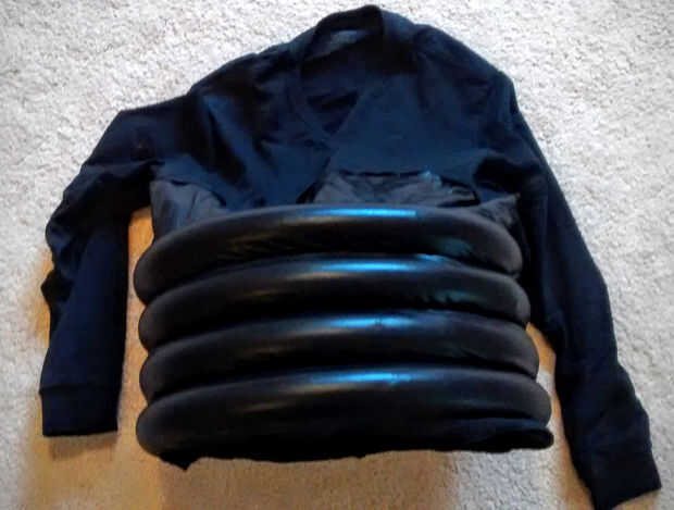 6. Añadir alinea en el spandex espaciados por la mitad-circuference más un 1/4 pulg. Coser las líneas entre la camisa y el spandex. Esto puede requerir algunos alfileres para obtener las líneas para que coincida con. Es una pena, pero se verá bien en el final. Asegúrese de dejar abierto el compromiso para que usted pueda moverse en el tubo de espuma.