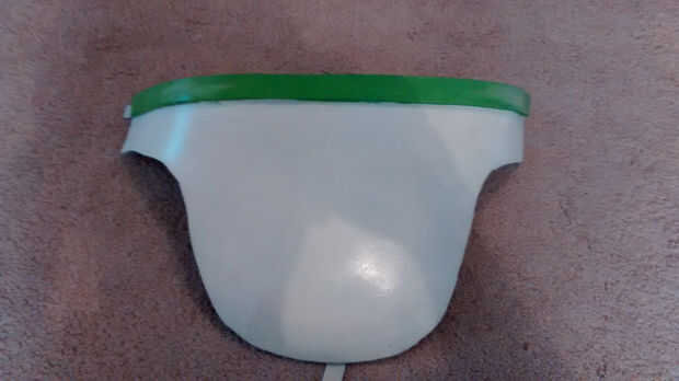 este traje tomó muchas horas para hacer pero con determinación es bastante factible.  Materiales se necesitan incluyen: papel maché, espuma de EVA (home depot), tela de piel artificial blanco y vinilo verde (ambos en tela JoAnns), zapatos de platafor