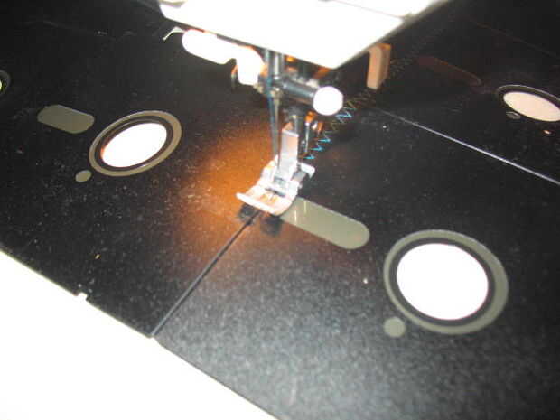 Debe definir la máquina de coser para hacer algún tipo de puntada ancha que cubra las uniones entre los discos, esto ahorra tiempo, energía e hilo comparado con costura en cada disco individualmente. He recopilado unas puntadas posibles. Cuando está terminado con el doble de discos sobre esa media pulgada adicional para hacer un dobladillo.