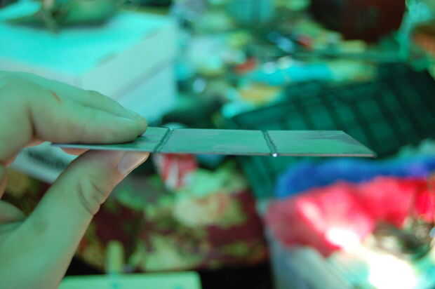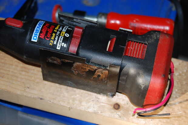 Para garantizar los pliegues utilicé un soldador de mig y había soldada en las esquinas. Tuve que llevar a cabo una dremel con cable para moler abajo de las soldaduras para que la batería dremel encajaría en la "U" en forma de soporte fácilmente.