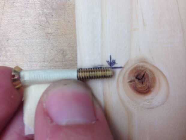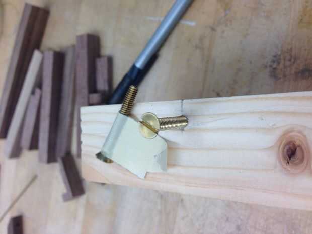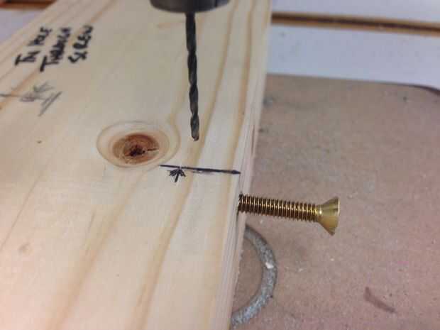 En primer lugar, perfore un orificio de 1/8" un pedazo de madera de desecho que está tan cerca como usted puede encontrar la cuadratura. Esto se convertirá en el agujero para el tornillo de latón.