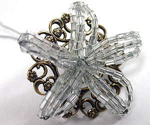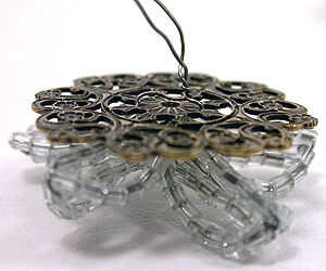 Usando tus manos, doblar los pétalos en la vendimia posey hacia arriba y como se muestra. Enrosque el cable madre posey a través del frente de una de las flores de filigrana plana y utilice este hilo para coser la flor a la filigrana al pasar el alambre a través de la filigrana varias veces. Cuando la flor es segura, el cable restante del vástago de la bobina y presione contra la parte posterior de la filigrana. Dejar de lado flor de filigrana.