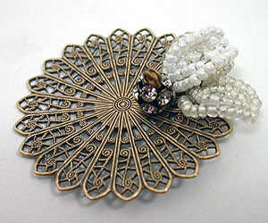 Usar el mismo método para unir las tres hojas de cuentas vintage a un lado del círculo grande filigrana. Se agrupan las hojas que se superponen y fíjelos con sus tallos de alambre. En la base del racimo de la hoja del hilo de rosca un alfiler de cabeza desde atrás de la flor hacia arriba a través de la superficie. Lugar el grano de la perla en el pasador de la cabeza. Utilizando los alicates de punta redonda agarre el extremo del perno de cabeza y enrollamiento hacia el grano hasta que el grano es seguro. Esto producirá un giro en espiral, vástago-como en la parte superior del talón. Repita con el grano de diamante de imitación y las bolas de cristal facetado. Dejar de lado círculo de filigrana.