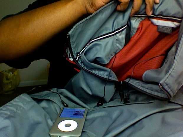 Paso final una vez los teléfonos del oído están fuera de las ranuras, gire su chaqueta derecha, agarrar su dispositivo musical, coge la salida de las teléfonos del oído del bolsillo elegiste, conéctelo a su dispositivo musical y seleccionar la canción que desea escuchar, entonces puesto le en el bolsillo y estar en su camino.