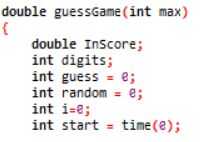 • Inicialmente usted tendrá que incluir las variables para trabajar con así como inicialización de tiempo. Tiempo está incluido en la librería time.h , donde escribió en las primeras líneas de la función. Se necesita tiempo para calcular el puntaje y también la semilla del generador de números aleatorios.