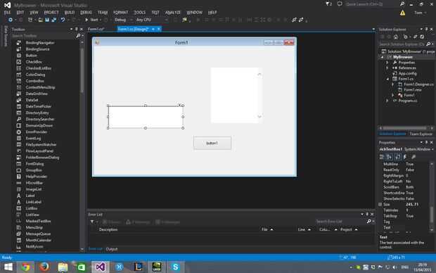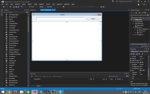 Arrastrar desde la caja de herramientas a la derecha de tu pantalla un botón, un TextBox y un navegador web.