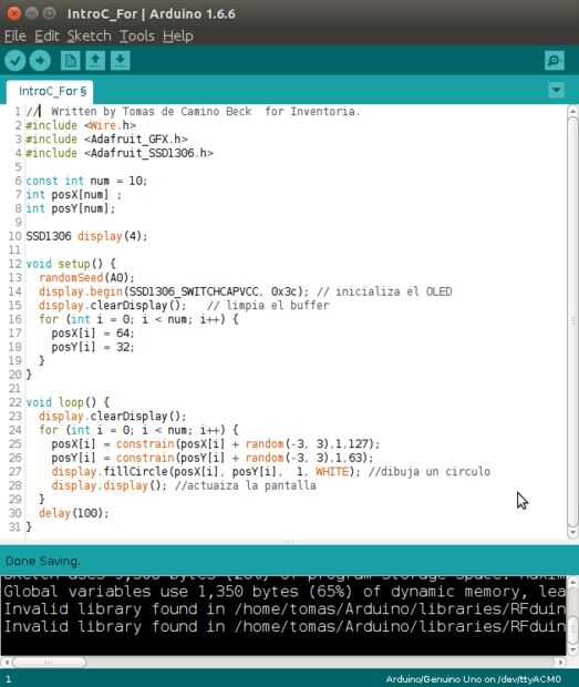 for (int i = 0; i < num; i++) { posX[i] = constrain(posX[i] + random(-3, 3),1,127); posY[i] = constrain(posY[i] + random(-3, 3),1,63); display.fillCircle(posX[i], posY[i], 1, WHITE); display.display(); } Volvemos a utilizar un ciclo para, para cambiar los valores de posición x, y. En la línea,