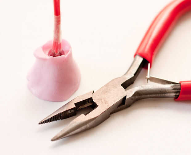 Inserte todos los tres conectores en los cables en el molde. Presta la atención que los tres deben mantenerse bien en contacto con la base del molde, porque no queremos que la resina va en su interior desde la parte inferior. Así alicate fino para poner en su lugar.