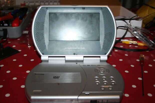 Esto es totalmente portátil, funciona de la batería DVD original que se acopla a la parte posterior de la caja.