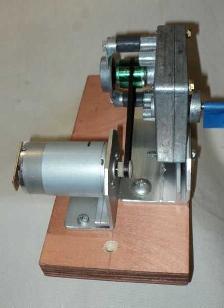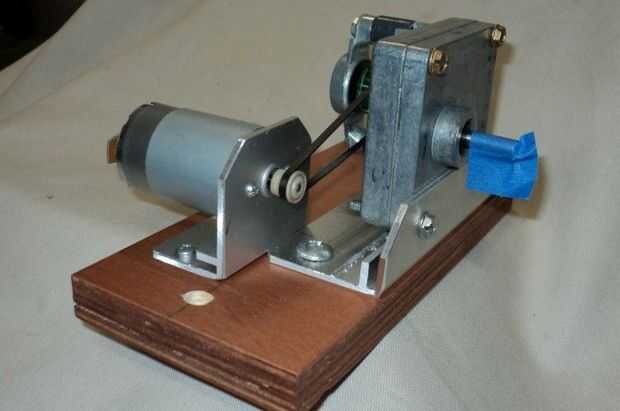 Usé un motor de carro de impresora y una correa de transmisión de G2 guardada para transmitir energía del motor a la caja de cambios. El rotor sirve ahora como un polea de reducción con un poco de acción de la rueda volante. Ángulo de aluminio de chatarra es fabricado para sostener los dos componentes principales en su relación apropiada y se fijan a una base de madera simple. El soporte del motor para permitir el tensado y ajuste de la correa de seguimiento para que se ejecute cierto se perforaron los agujeros ligeramente sobredimensionados. El nuevo motorreductor de velocidad variable D.C. está listo para la operación de velocidad hacia adelante, reversa y continua, así como ser portátil si así lo desean.