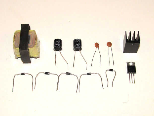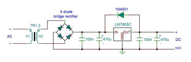 -5 diodos. 1N4001, 1N4004, 1N4007 funcionará todo bien. Se puede sustituir a 4 de ellos para un rectificador de puente construido a propósito, pero necesita el quinto para revertir el sesgo de la salida del regulador.