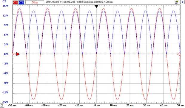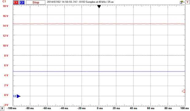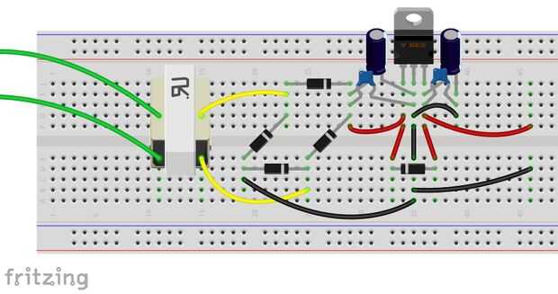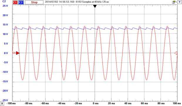 Imágenes 3 y 4 son o alcance para mostrar lo que está sucediendo en el circuito. Después de los pasos de transformador el voltaje AC el puente del diodo hace que la señal de DC, pero con algunas fluctuaciones graves. Imagen 4 muestra por qué agregamos el condensador suavizado. Esta imagen fue tomada con un condensador más pequeño por lo que me pude destacar el efecto que tiene el condensador en la señal. La tapa de la lista de partes dio una línea casi plana por lo que era difícil de ver.