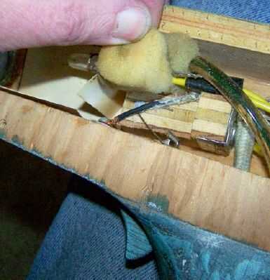 Además el disparador de la madera contrachapada para el interruptor, utilicé un alfiler común para proporcionar una fuente. También se utiliza dos aletas de aluminio. Había doblada la punta de la punta afilada sobre en ángulo recto y me coloqué en su respaldo de madera. Un pequeño tornillo a través del lazo de la primavera en el perno de seguridad sirve como eje para el resorte del perno de seguridad. También se puede ver la espuma de tapicería que solía montar el tubo de flash y protegerlo de golpes y choques.