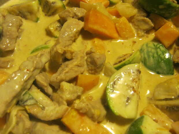 Añadir 2 cucharadas generosas de rojo pasta de curry y revuelva para cubrir.  Añadir la leche de coco y salsa de pescado.  Cubra y cocine a fuego lento durante unos 20 minutos. Sazona al gusto con azúcar de Palma y sal del Himalaya, decorar con cebolla verde picada.  ¡ Disfrute!