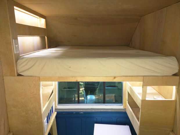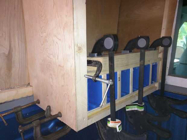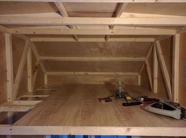 He utilizado madera contrachapada de 1/4" debajo del colchón, el resto del interior es 1/8". Espuma de poliestireno fue utilizado para llenar todos los espacios entre los miembros de la estructura. Paneles interiores estaban pegados al marco, con abrazaderas y grapas. Todas las grapas fueron quitadas más adelante.