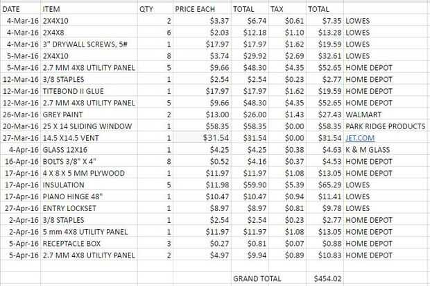 Me he pasado $454 para la caravana hasta el momento, aunque probablemente utilicé otro 50 a 100 dólares de tornillos, clavos, partes eléctricas, etc. que quedaron de otros proyectos. Así que puedo decir con seguridad el camper cuesta menos de $600. Si desea agregar en el acondicionador de aire, microondas, refrigerador y colchón es todavía bajo $1000.