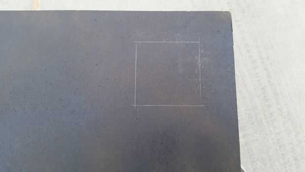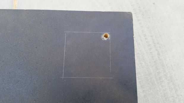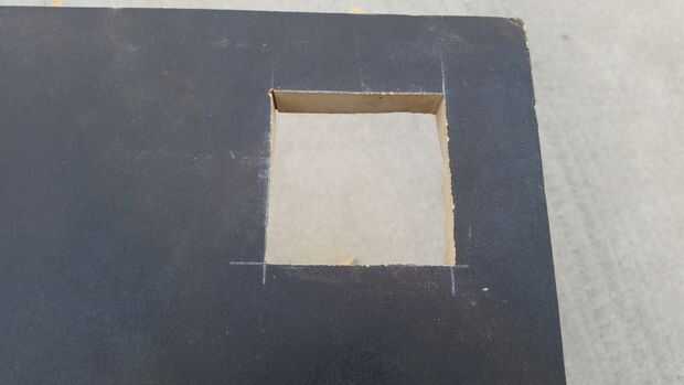 Medir el dispositivo para el montaje. Mina era un cuadrado de 2-13/16. Marcar donde quieres que tu agujero. El mio es 1-1/2 pulgadas de cada borde.