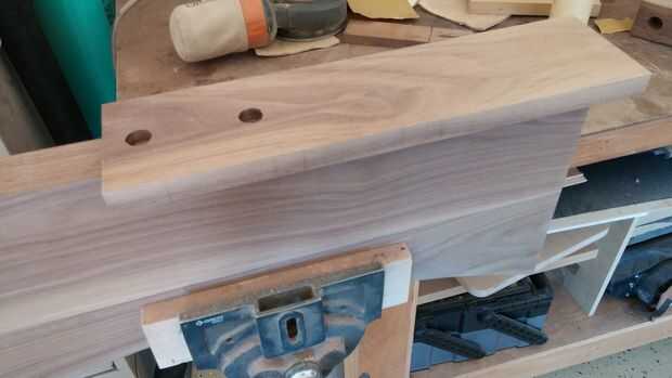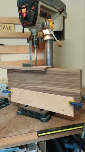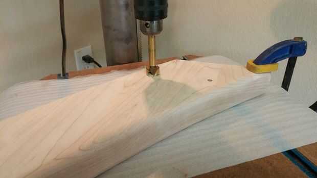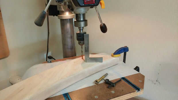 Desde el paso anterior de la corte de la camilla, se verá que tienen 1/4" agujeros del localizador que ir todo el camino a través de la camilla. Había equilibrado y nivelado la camilla entre una pieza de madera en mi mordaza de mesa y mi mesa del taladro, que me ha permitido a la camilla con la broca de la Plaza. Utiliza una 1/4 broca de centro en cada existente a través del orificio, sujeta el estirado en lugar y luego intercambiar hacia fuera la 1/4 broca para una broca de 3/4" forstner. Y luego que haga al menos 3/4" profundidad - esto deja una sección central de la barra de acero para sentarse contra.