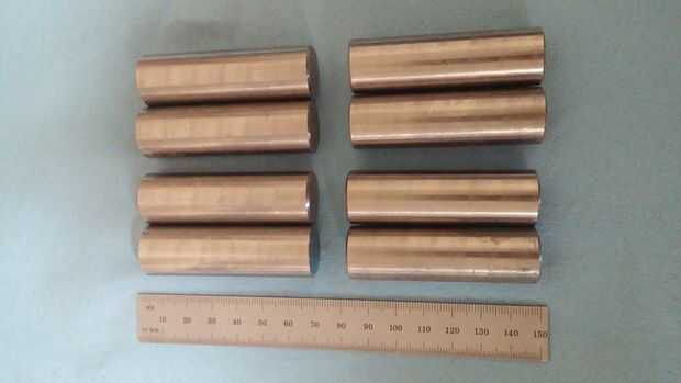Cortar 8 piezas de acero inoxidable de 3/4" de diámetro x barra de 2 pies. Cada pieza es aproximadamente de 2-1/2" pulgadas de largo y las puntas fueron biseladas en una lijadora de disco para permitir la inserción fácil. He comprado la barra de acero de Mcmaster-carr.