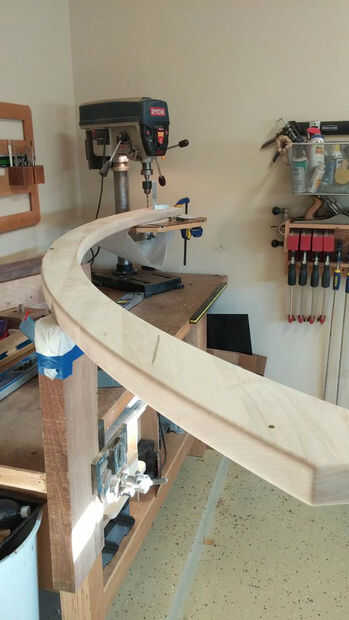 Esto no funciona tan bien como estaba previsto cuando primero traté de-cuando sujeta mi plantilla hasta el borde de la pieza de la pierna, tuve un tiempo difícil mantener la parte inferior de la pierna curvada perfectamente cuadradas para el taladro. Tenía que construir un accesorio especial para sostener la pierna Plaza y estable - decidí sandwich una de las piezas de chatarra curvado (de cuando en forma de la pieza de la pierna) entre 2 pedazos de madera contrachapada. Asegura a una perfecta al borde de la pieza de la pierna. I luego apilados la pierna en esta nueva plantilla, había cuadrado para el taladro y perforar 2 agujeros en cada una de las verticales de 4 piernas.