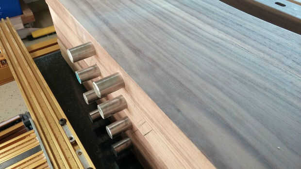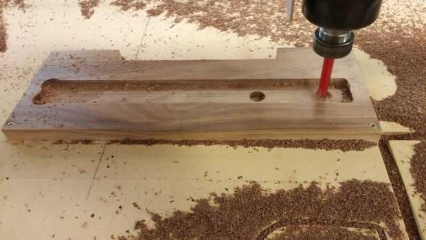 He decidido crear una plantilla para taladrar los agujeros exactamente el mismo para cada pierna. Medí la distancia de la base de la pata a cada agujero de mi dibujo de Autocad, luego he creado una plantilla en la CNC para asegurarse de que todos los 8 agujeros fueron perforados exactamente la misma distancia desde la parte superior de la pierna. Es básicamente un bolsillo que pone en el borde de la pierna registrarse en la parte superior de la pierna y tiene dos orificios de 3/4" para guiar mi broca.