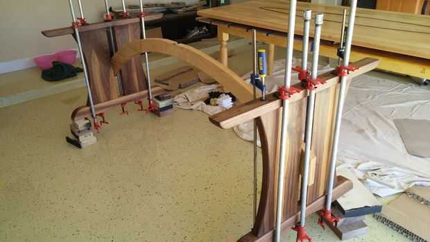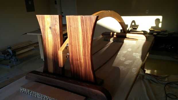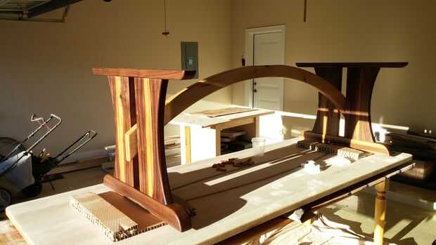 Hice un ajuste de secado final de las piernas y Camilla, incluyendo los pernos de acero inoxidable. Todo parece alinearse bien, así que puse todas las piezas nos dispusimos para la glueup. La camilla fue suspendida entre las verticales de la pierna y sujeta libremente juntos. Entonces las espigas fueron pegadas en las partes inferiores de las piernas y atadas. La Asamblea fue volteada y se repite el proceso para la parte superior. Tuve que levantar la Asamblea en bloques para permitir mi abrazaderas para ajuste.