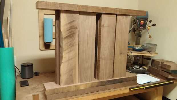 Limpia estas tablas utilizando una Machimbradora y cepilladora (esto fue demasiado para hacer a mano). Todavía tomó la parte mejor de una mañana para recibir a todos estos limpian y listo para glueup. La foto de arriba muestra las verticales y las piezas de fondo listo para formar. Las verticales se pegan para arriba en este punto, pero no pegue estas piezas entre sí hasta casi el final del proyecto, debido a la manera de la camilla está montado.