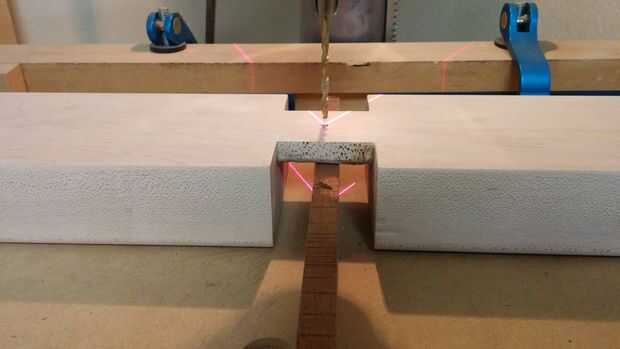 Comencé cortando un pedazo ancho de 3-1/2" de arce de una de mis piezas de chatarra. Uno de los lados ya estaba bastante plana, por lo que procedí a mi cepilladora y traído hasta ~1-5/8 "grueso (aproximadamente lo mismo que la parte superior de la pierna). Sólo tengo una hoja de 3/8 dado emplea para picar hacia fuera secciones medianas para que esta pieza podría interactuar con la muesca en la parte superior del arco. Porque la camilla era corte de la máquina CNC, el interior se redondean las esquinas de la ranura por el radio de la broca de fresadora. Por lo tanto utilicé un pequeño archivo para redondear las esquinas exteriores en sección central del travesaño.