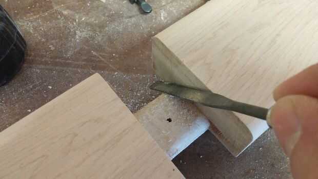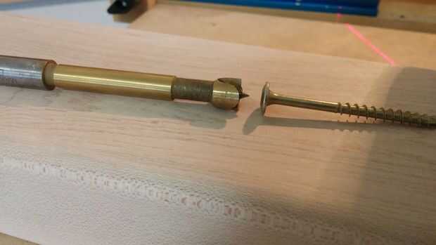 Taladré un agujero en el centro de esta pieza donde se adherirá a la camilla (un bloque de soporte fue utilizado para evitar que el agujero que sopla hacia fuera la parte inferior). Yo también 4 agujeros perforados a través de la pieza donde puedo el tornillo en la tapa de tabla. Fueron creados nichos para estos 4 agujeros con una broca forstner para ocultar las cabezas de los tornillos. Los 2 agujeros del exterior eran mucho demasiado grandes para permitir el movimiento de mesa.