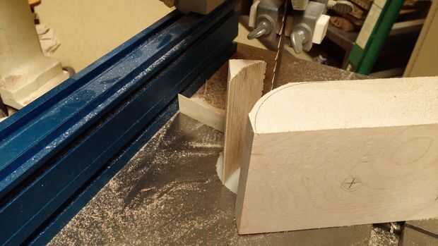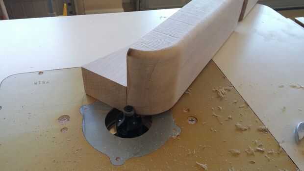 Dibujaba una curva en cada extremo áspero recorto en la sierra, y similar a los anteriores pasos, infiltró para arriba en la línea con una lijadora de banda. Después de los extremos fueron alisados, usé la mesa de fresadora para redondear los bordes. Usé un bloque de soporte para evitar que arranque de grano de extremo.