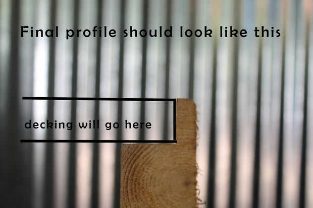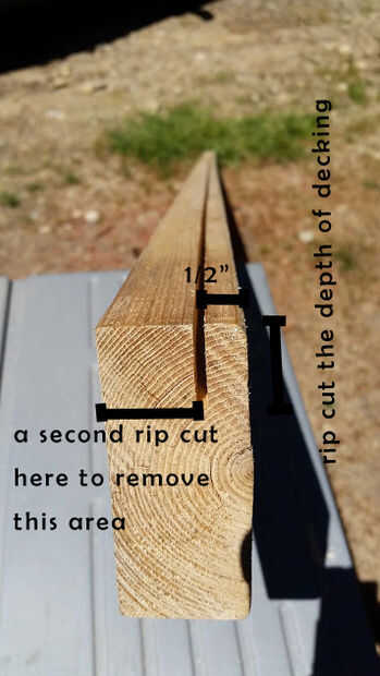 Va a crear 'muesca' madera que dará a su mesa una agradable mirada limpia. Desde madera compuesto tiende a variar en profundidad dependiendo de la marca, mida la profundidad de su compuesto y rasgar un corte abajo de la 2 x 4 la misma profundidad de su compuesto (u otro material decking) usando la Sierra de mesa (en nuestro caso se trataba de aproximadamente 1") y 1/2" en su madera. A continuación, hacer un corte segundo corte para quitar el exceso de madera y crear su muesca.