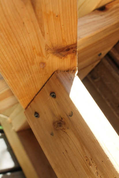 Voltear la mesa boca abajo y ajuste las piernas en un patrón cruzado ajustado dentro de la parte inferior de la tabla contra la plataforma y apoyada en la madera con muescas. Estos casi deberían estar por sí mismos en este punto. Atamos nuestro usando dos tornillos desde el interior (para no ser visto) y luego un adicional dos tornillos donde la Cruz apoyos conoce, siempre recordando a pre perforar nuestro.