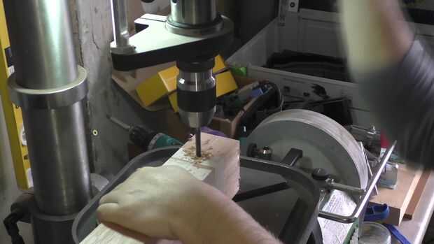 En el taladro perforé agujeros de 10mm cada 100mm en las marcas. Fuera de la cámara he apoyado un extremo de la pila para que se sienta en la mesa del taladro. Desafortunadamente el paso en el taladro no es más que suficiente para ir todo el camino a través de la pila de madera. La pieza inferior en la pila sólo obtener perforada a medio camino a través. Esto realmente no es algo malo ya que supone que no tener que preocuparse de ruptura en esta etapa.