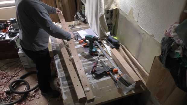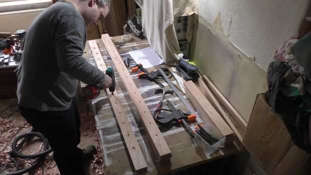 El siguiente trabajo es agregar los orificios de ajuste para las piernas. Quiero agujeros cada diez centímetros y es importante que ellos son exactamente iguales en cada pieza de la pierna. La forma más sencilla de asegurarse de que son las mismas es perforar todo al mismo tiempo.
