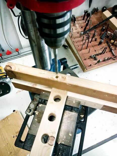 También para estas piezas tienes ahora a taladrar y encolar tacos. Utilice dos clavijas para cada conexión. Déjelo secar durante algunas horas.