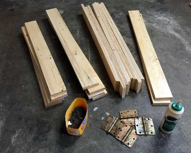 Mis bisagras eran 89 mm (3 1/2") de ancho, así usé como guía para la anchura de cada pieza. Tenga en cuenta que las dimensiones que aquí en la lista son para caballetes cuyo tamaño ha sido retocado para que cuatro se pueden cortar de una sola hoja de madera contrachapada; no son lo mismo que construí. Pero eso de OK - mina son (como yo) inusualmente alto y la mayoría de la gente prefiere un poco más corto que de todos modos.