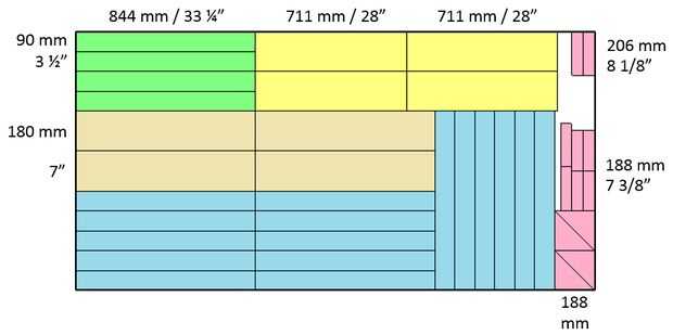 8 piezas de 844 × 90 mm (33 1/4 "× 3 1/2") de corte transversal a 20 grados a cada lado (en paralelo). Estas son las piernas.