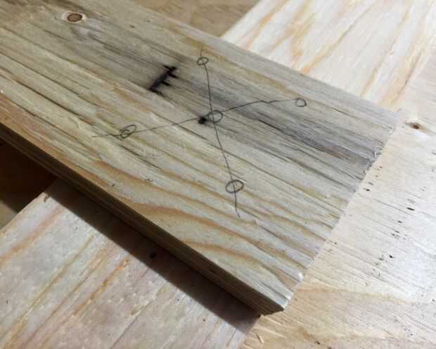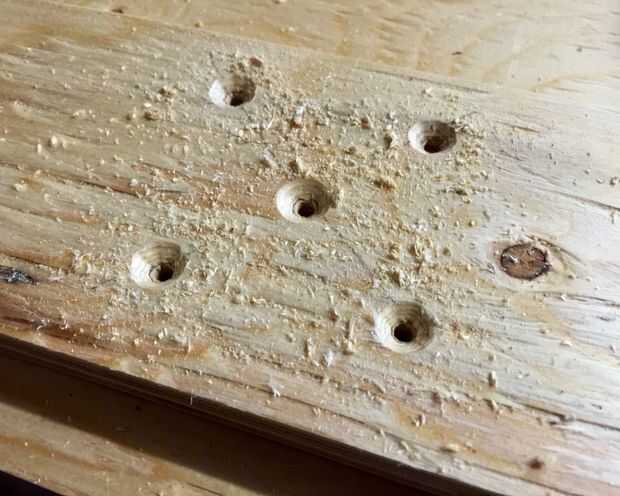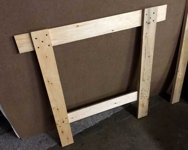 Corté una pieza de contrachapado 80 × 200 mm * para actuar como un palo de la historia - me dio las dos dimensiones críticas para la Asamblea, la distancia que el travesaño superior asomaba más allá de las piernas y la distancia desde la parte inferior de la pierna hasta la parte inferior de la traviesa. Trabajé a donde necesitaba para perforar los agujeros en las piernas (asegurándose de que no van a chocar con los tornillos de la bisagra) y cinco en forma de cruz para cada articulación. Utiliza esa pieza como plantilla para las piernas otras 7 y luego había avellanado todos los agujeros. Perforé por las patas a los travesaños para que los tornillos eran menos obvios. Luego pegado y atornillado todos los cuatro pedazos juntos (encuadre en cada paso para asegurar) y repetidos 3 veces más para las cuatro mitades. He utilizado un montón de pegamento y 1 1/4" tornillos para drywall madera. 1 1/4" tornillos de panel de yeso no son especialmente fuertes, pero con un área de pegado para cada conjunto de > 12 pulgadas cuadradas, no estaba preocupado - el pegamento hace todo el trabajo. Lo pude probablemente han hecho con mi pistola de clavos, pero los clavos que tenía eran demasiado cortos.
