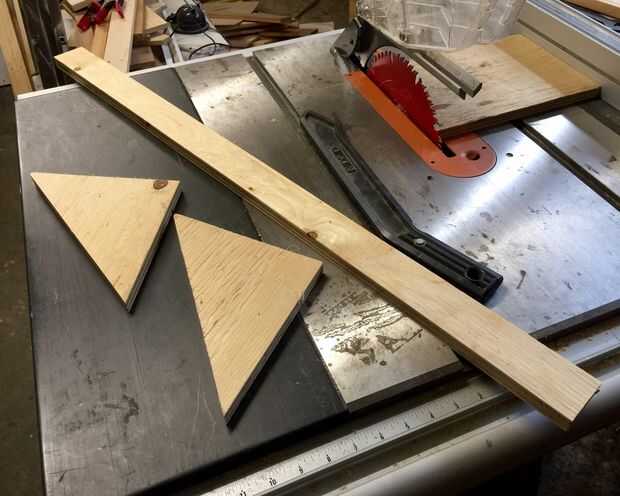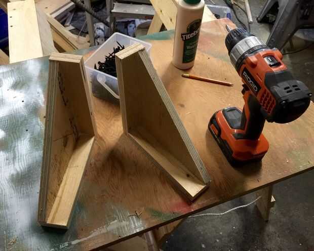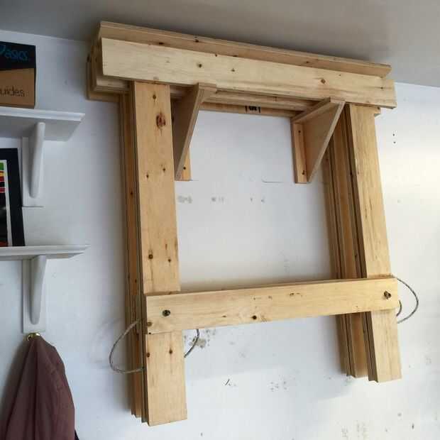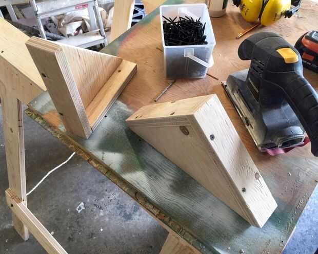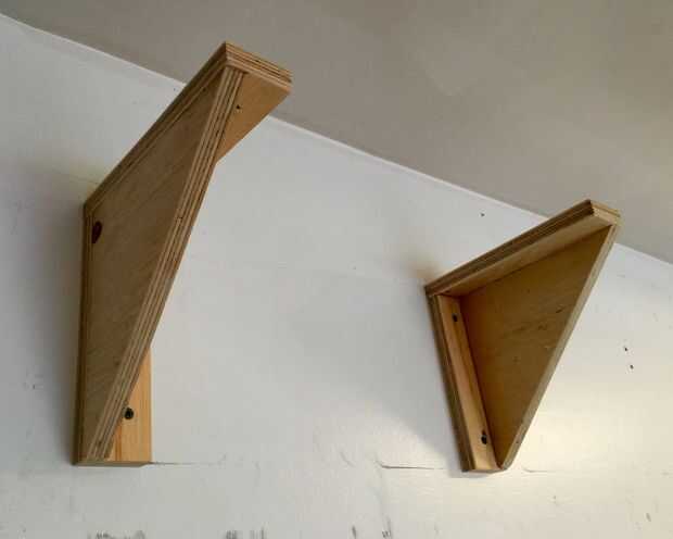Ahora que han hecho sus caballetes, desea colgarles estorbe cuando no los está utilizando. Aquí es un plan simple para hacer perchas de unos recortes de madera contrachapada. Corte dos rectángulos de dimensiones 188 × 50 m m (7 3/8 "× 2") y dos de dimensiones 206 × 50 mm (8 1/8 "× 2") y dos triángulos 188 × 188 mm (7 3/8 × 7 3/8"). Pegamento y tornillos (yo usé 2" tornillos) estas juntos como se muestra, luego atornillan los soportes a la pared un par de montantes adyacentes (yo usé tornillos de 3"). Si ha realizado cuatro caballetes de una sola hoja de madera contrachapada, sus recortes será lo suficientemente grande como para hacer las suspensiones así (ver diagrama de corte en el paso 2).