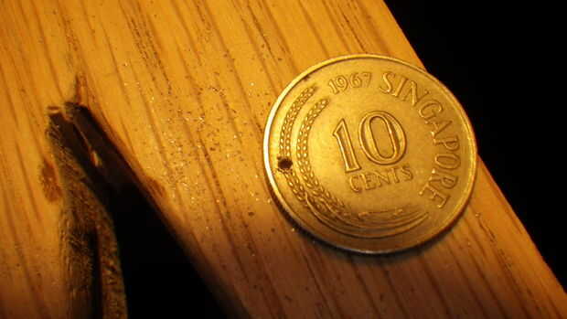 Sería útil poner la moneda en una especie de mordaza mientras haces este paso, así como probablemente más seguros. Gafas de seguridad son una necesidad pero como cuando los pedacitos de taladro son este finos son muy propensos a romperse y no quieres un pedazo de la moneda o una broca en su ojo.
