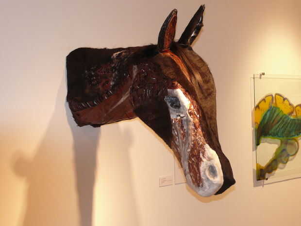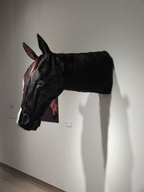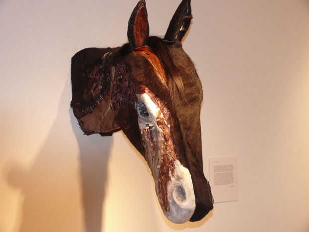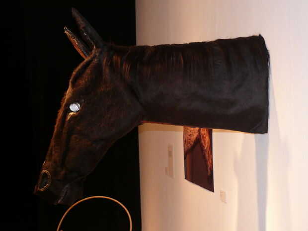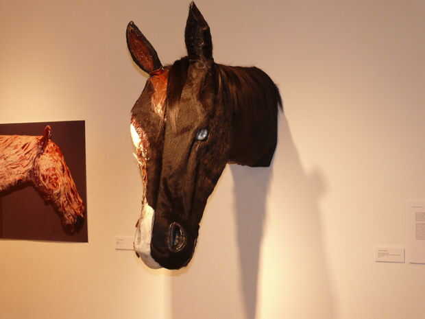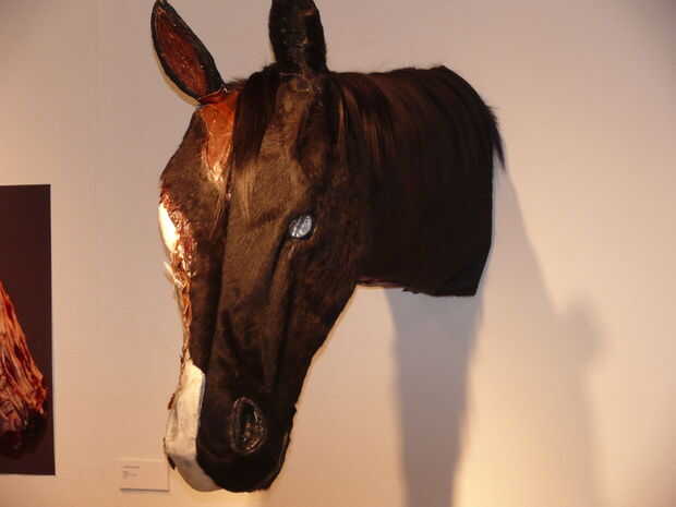 esta es la segunda cabeza de caballo de tamaño vida que he creado. Fui a un establo y tomó medidas exactas de la cabeza y el cuello de un caballo particular. En lugar de crear una armadura de madera pesada he optado por la espuma mucho más ligera. Corte las dimensiones necesitaba en una sierra de cinta y luego pegar varias capas de espuma para crear un bloque grande. Desde este punto afeitó cuidadosamente la forma del caballo (creo que todavía tengo espuma azul en mis pulmones). Después de la forma exacta para las mediciones pude luego adherir la espuma lo que necesitaba. Decidí hacer a un lado de la cabeza y el cuello para ver como si fuera un caballo real... por otro lado quería crear el efecto que la piel se pela lejos para exponer el músculo y el hueso por debajo. El lado de la vida fue envuelta con cuero negro y las crines se crearon con cabello humano (de la fuente de belleza de Sally). El otro lado es una combinación de cecina de carne, prosciutto, cera, cuero, yeso y pintura. También elegí una fotografía de un cordero para dormir poner dentro del ojo de vidrio (he incluido un detalle de tiro). Así que si estás en Taxidermia pero no matar animales... (que la declaración sea un oxímoron)... esto es una manera de conseguir ese pedazo de "trofeo" en tu muro.