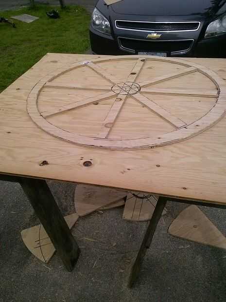 Seguí a youtube de Jennshaunt (https://www.youtube.com/watch?v=-xdMcjZyaEA) de las ruedas de corte. Básicamente obtener una plaza o un pedazo largo de piso de madera de 4 pies más o menos, un clavo y cadena y una pluma. Decida cuánto quiere a sus ruedas. Hice mina 48" diámetro y 40" de diámetro. Dibuja tu círculo y luego dibuja el círculo. Usted querrá dejar un espacio de 2-3" desde el borde de la rueda para el inicio del habla. Siga el video que relaciona por encima de sus medidas y como mina similar a menos rayos. Corte las ruedas y apartarlas. MANTENER los desechos de la madera de los recortes de la rueda. Usaron para los lados de compartimiento del conductor. Construí los árboles y tal al final.